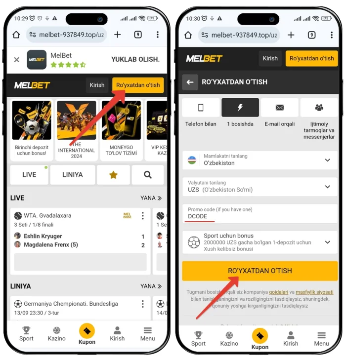 Melbet saytidan O‘zbekistondan ro‘yxatdan o‘tish uchun qanday promo-kodlar kerak? Bugungi kunda siz bukmeker saytida hisob yaratsangiz, rasmiy 2024 yilgi promo-kodni – DCODE kiriting va bonusga ega bo‘ling. Ushbu Melbet promo-kodi “Xush kelibsiz bonusi”ni 30% ga oshiradi – masalan, O‘zbekistondan ro‘yxatdan o‘tganingizda 2.000.000 so'm o‘rniga 2.600.000 so'm bonus olishingiz mumkin.