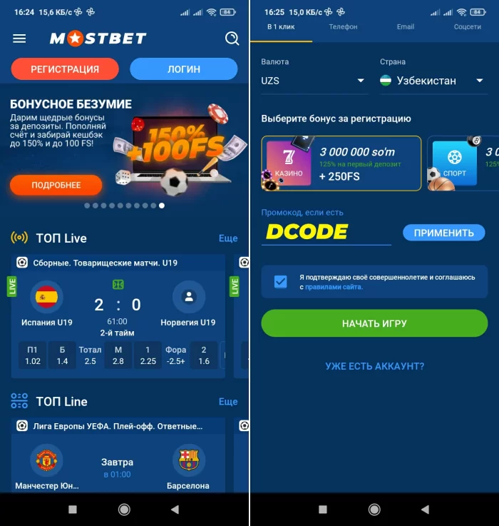 Hoziroq Androidga MostBet ilovasini yuklab oling va «DCODE» promo-kodi bilan ro‘yxatdan o‘tish uchun Xush kelibsiz bonusiga ega bo‘ling: