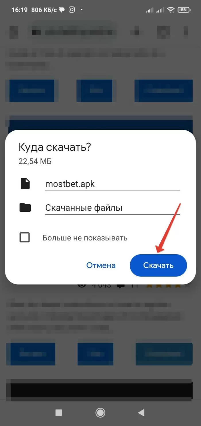 Yuklab olish boshlanishidan oldin smartfon ekranida xabar paydo bo’ladi: «Ushbu turdagi fayl qurilmangizga zarar etkazishi mumkin. Siz baribir mostbet 4.7.apk ni saqlamoqchimisiz?». Ushbu xabarni yopmang, lekin «Yuklab olish» tugmasini bosing: